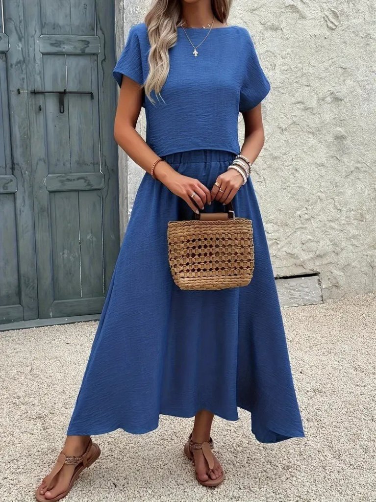 Kadın Kısa Kollu Bisiklet Yaka Bluz Etekli Ithal Keten Ikili Takım