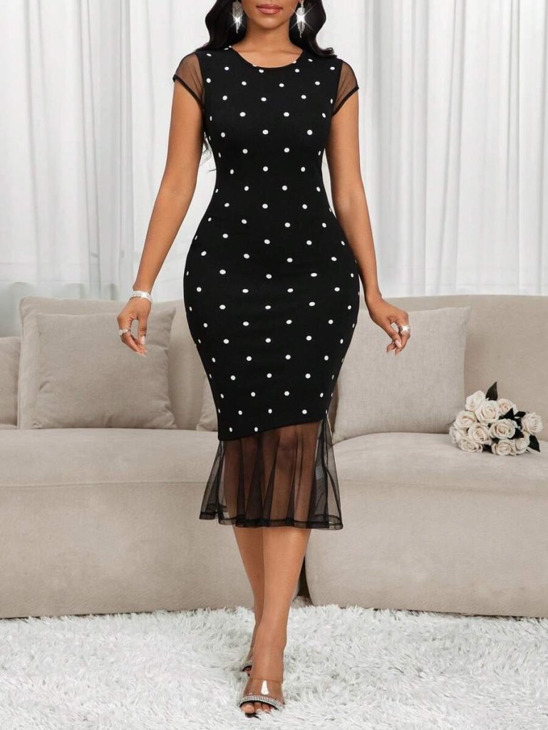 Kadın Kısa Kollu Bisiklet Yakalı Puantiyeli Tül Detaylı örme Krep Elbise