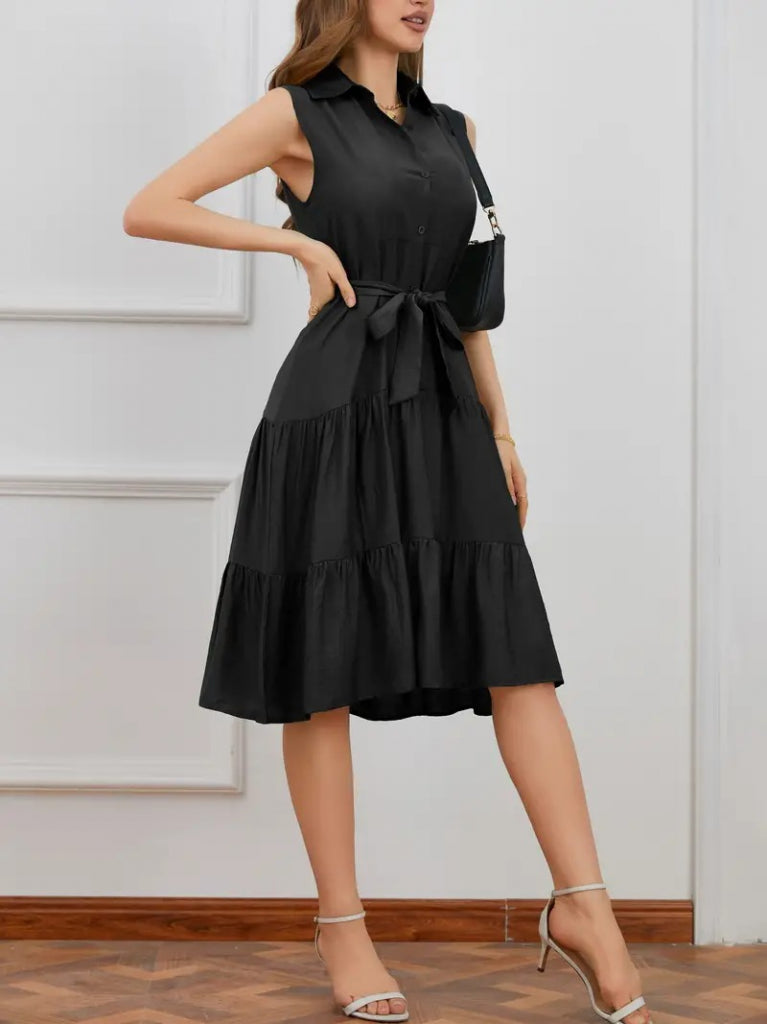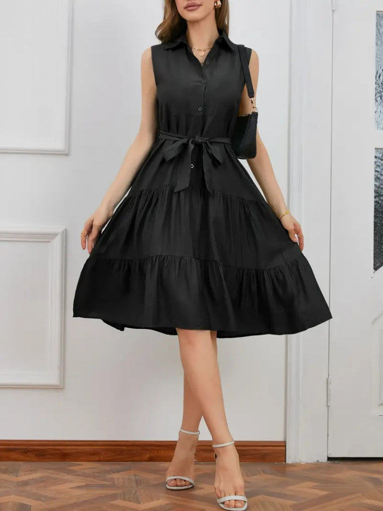 Kadın Kısa Kollu Gömlek Yaka Düğmeli Beli Kuşaklı Katlı Dokuma Midi Elbise