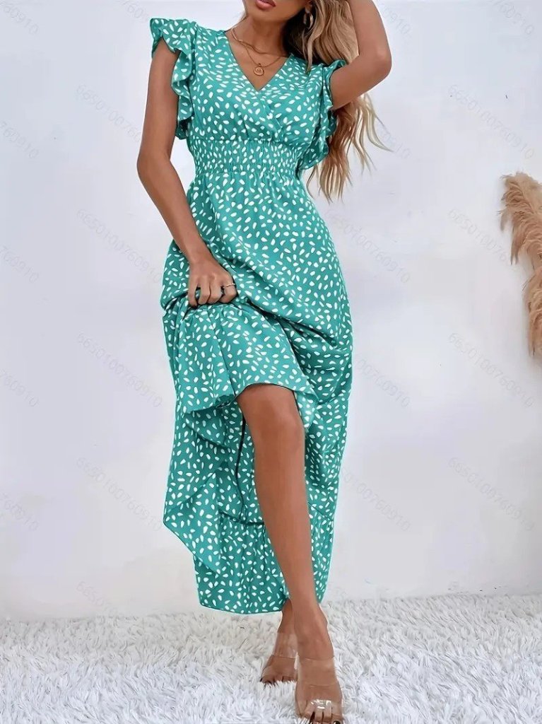 Kadın Kısa Kollu Kruvaze Yaka Beli Lastikli çiçek Desenli Elbise