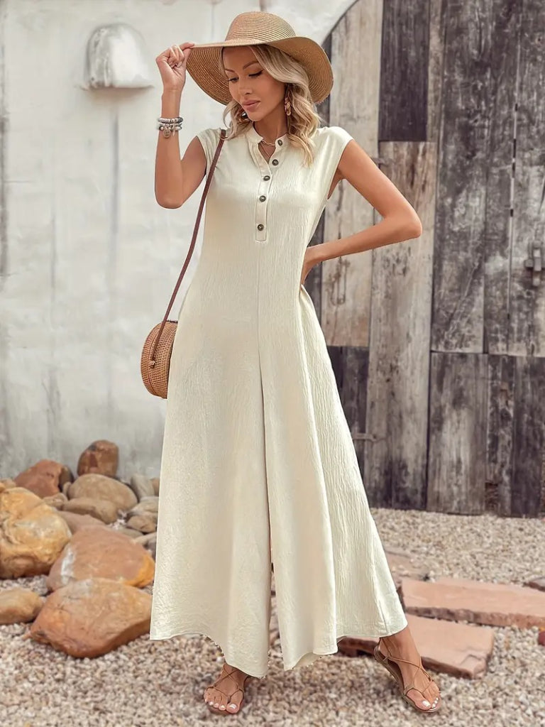 Kadın Kısa Kollu önden Düğmeli Paçaya Doğru Geniş Cepli Uzun Bürümcük Tulum