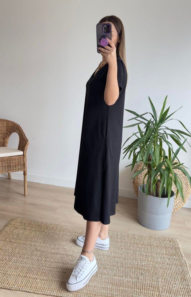 Kadın Kısa Kollu Yakadan Ve Etekten Fermuarlı Midi Viskon Iki Iplik Elbise