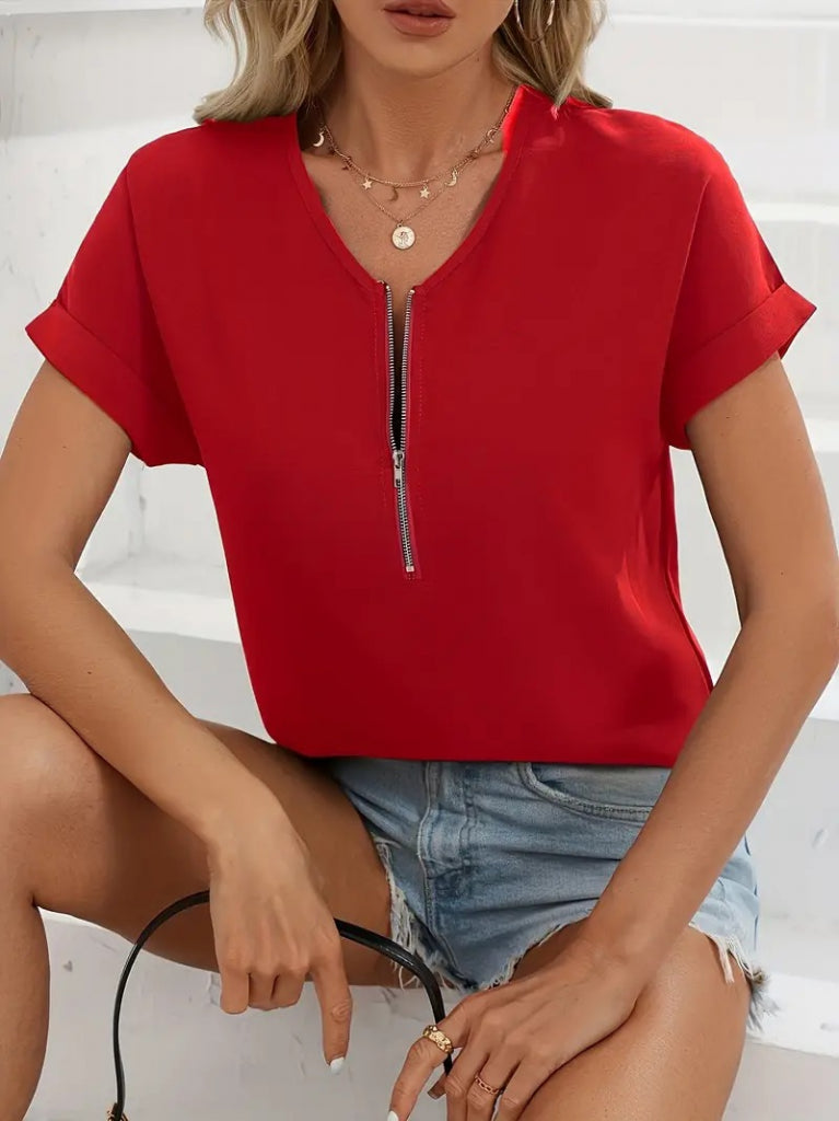 Kadın Kısa Kollu V Yaka Fermuarlı Salaş Sandy Bluz