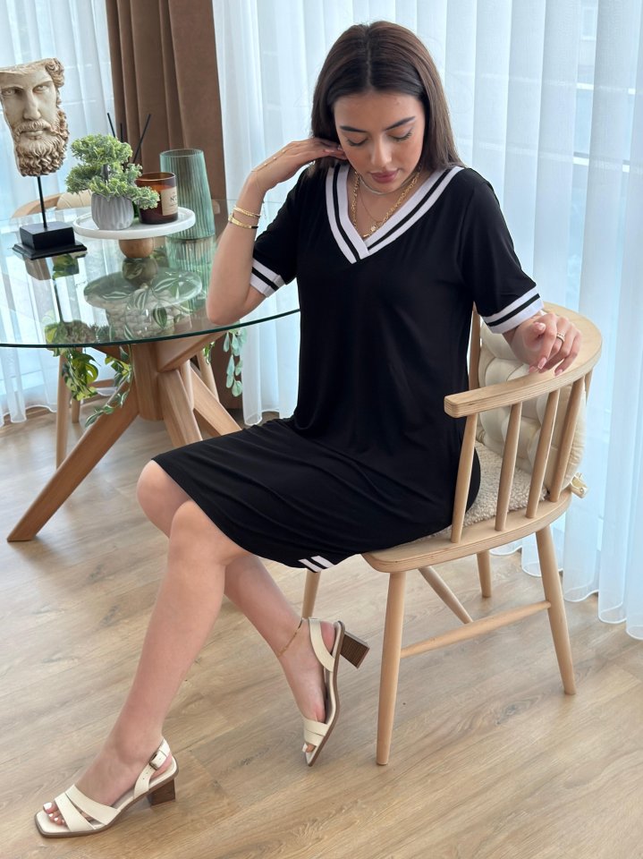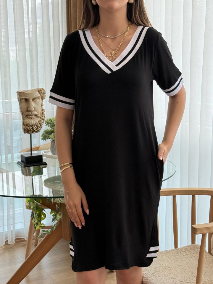 Kadın Kısa Kollu V Yaka Ribana Detaylı Cepli Dizüstü Viskon Elbise