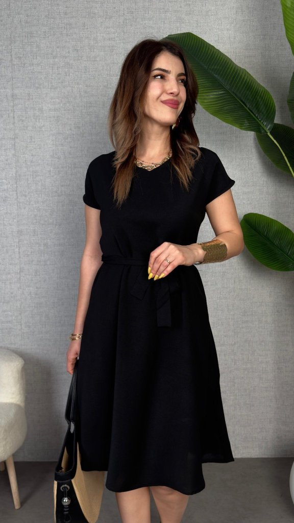 Kadın Kısa Kollu V Yakalı Beli Kuşaklı Ithal Keten Elbise