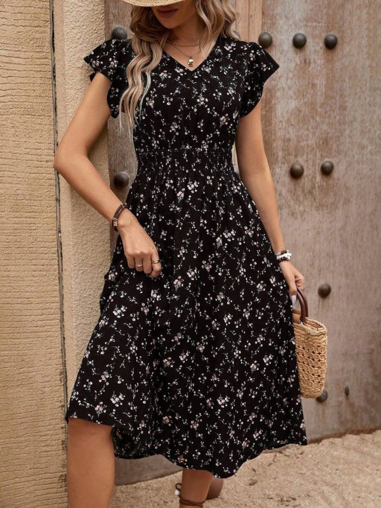 Kadın Kısa Kollu V Yakalı Beli Lastikli çiçek Desenli Süprem Elbise