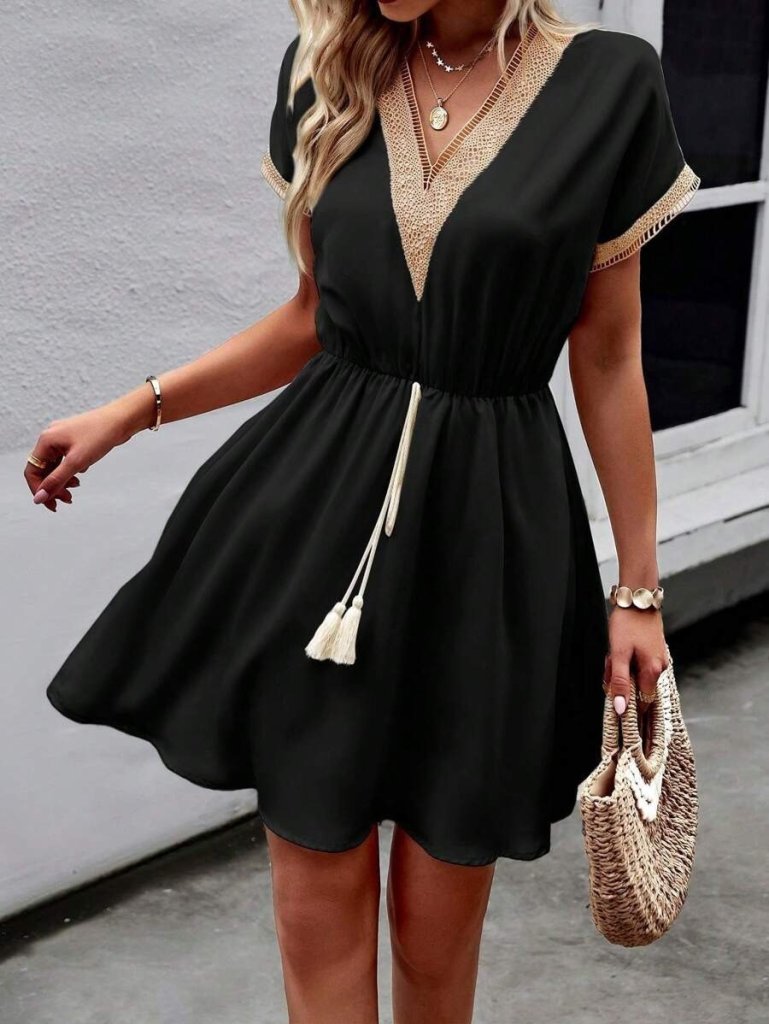 Kadın Kısa Kollu V Yakalı Belinde Bağcıklı Viskon Elbise