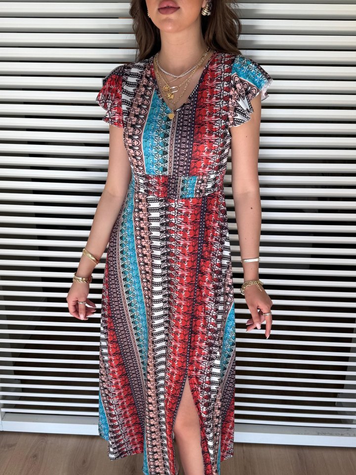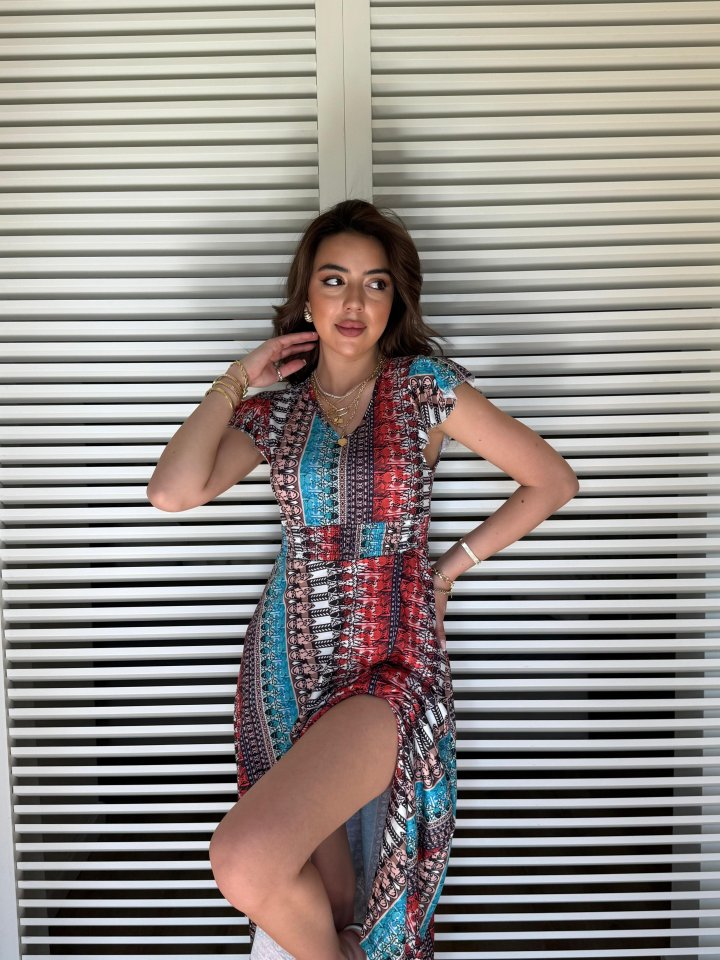 Kadın Kısa Kollu V Yakalı Desenli Yandan Yırtmaçlı Süprem Elbise