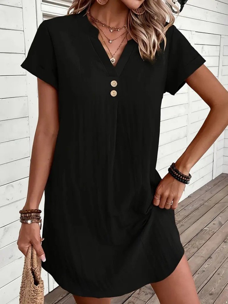 Kadın Kısa Kollu V Yakalı Düğmeli Müslim Kısa Elbise
