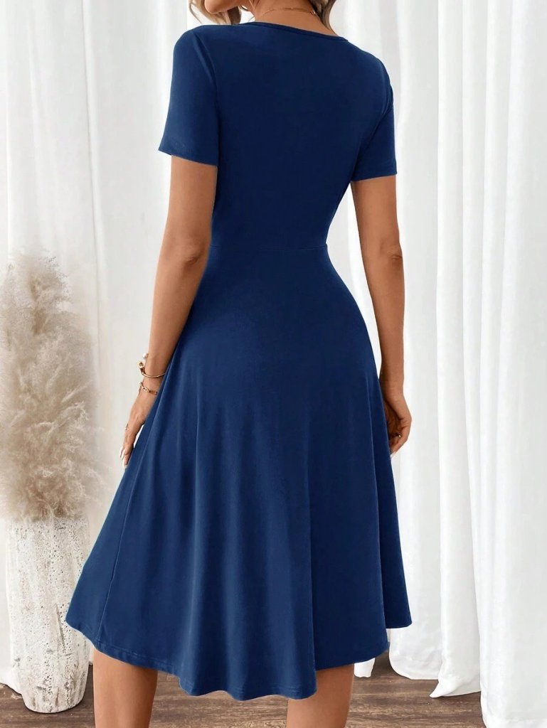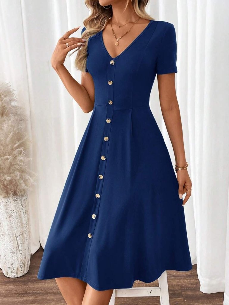 Kadın Kısa Kollu V Yakalı önden Düğmeli A Kesim Dokuma Elbise