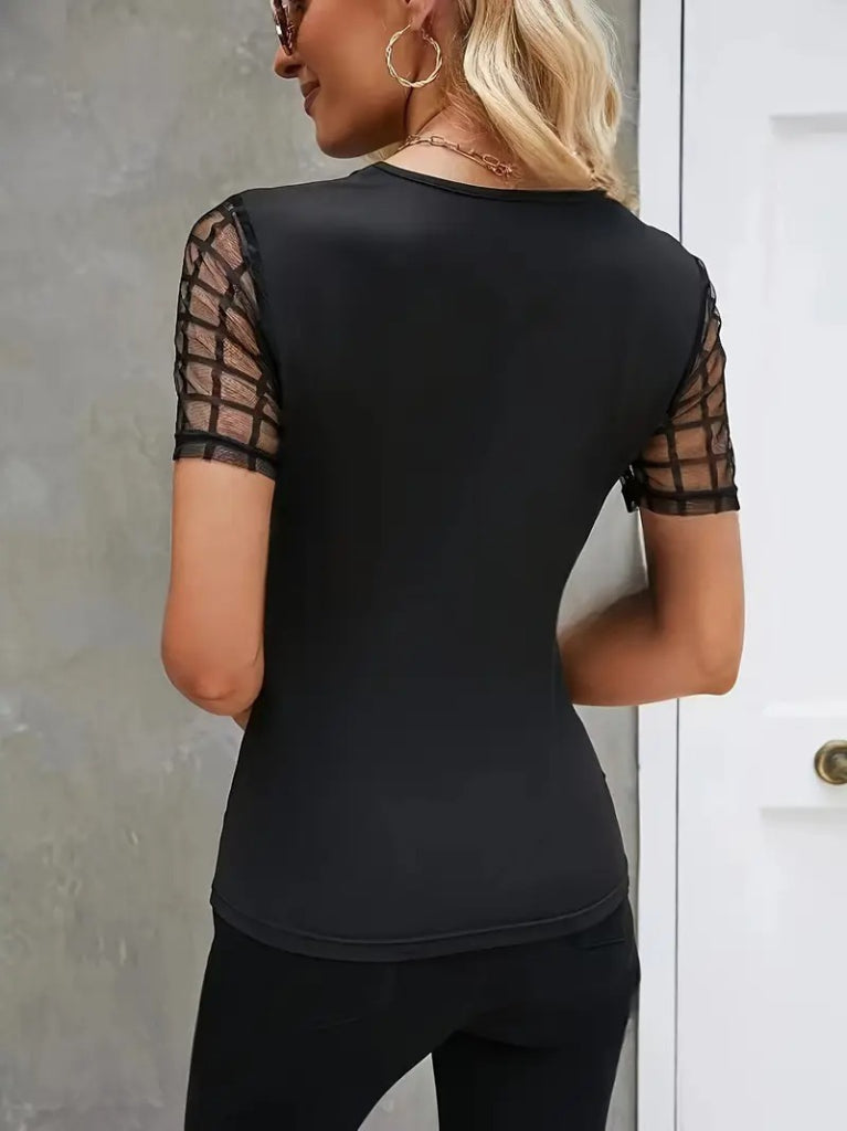 Kadın Kısa Kollu Yakası Açık Damla Ağ Tül Detaylı Viskon Bluz