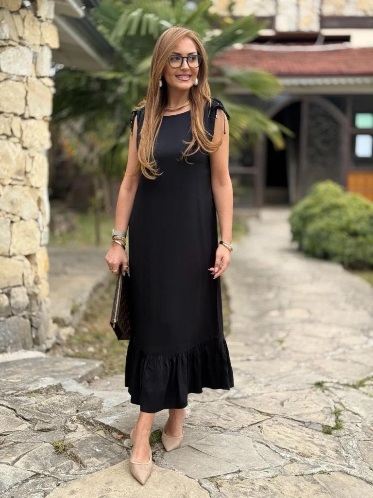 Kadın Omuzlardan Büzgülü Kayık Yaka Fırfırlı Janjan Krep Elbise