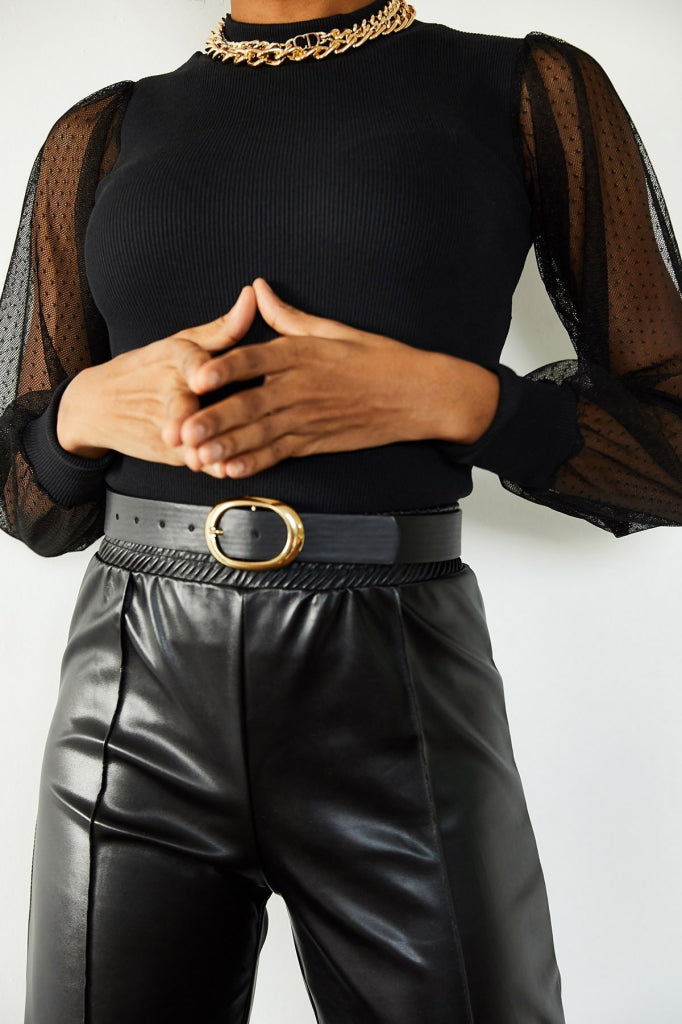 Kadın Siyah Kolu Tül Detaylı Yarım Balıkçı Kaşkorse Bluz 6160