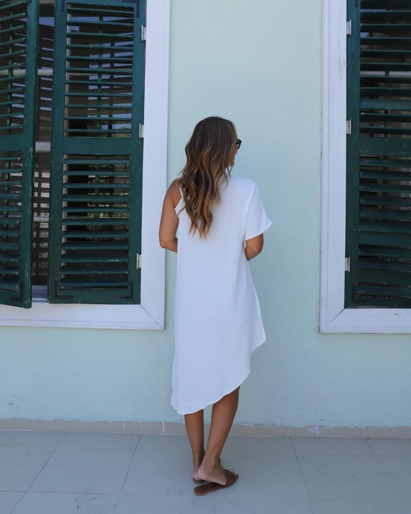Kadın Kısa Kollu Yakası Açık Katlı Bürümcük Balon Elbise