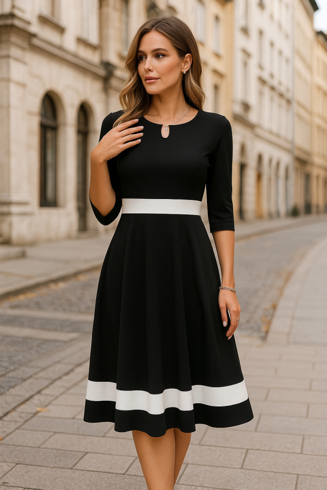Kadın Truvakar Kol Yakası Açık Blok Renkli Krep Midi Elbise