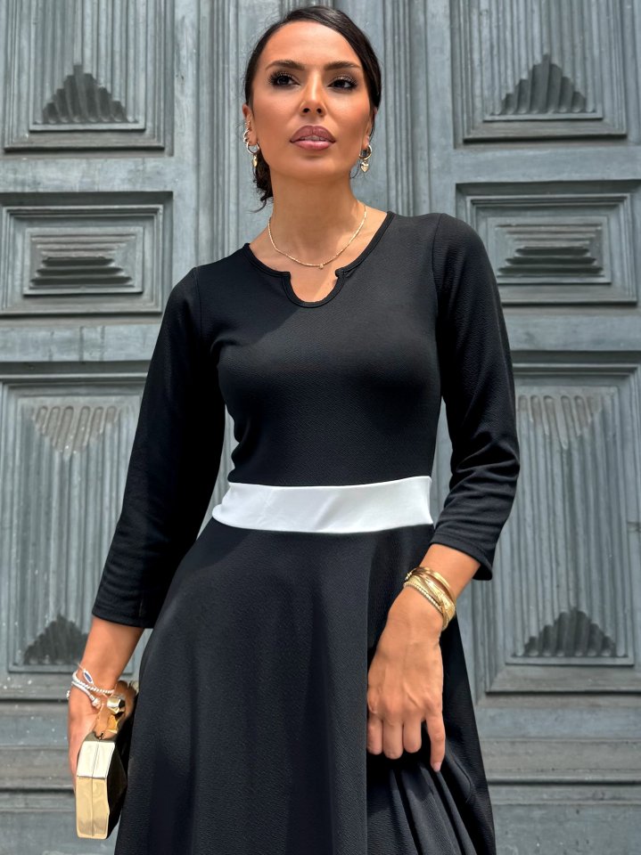 Kadın Truvakarkol Yakası Açık Blok Renkli Krep Midi Elbise