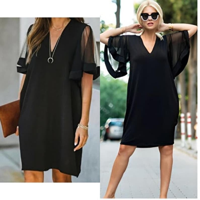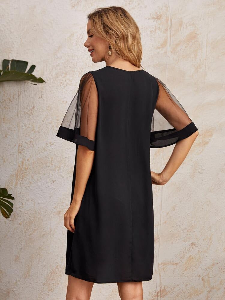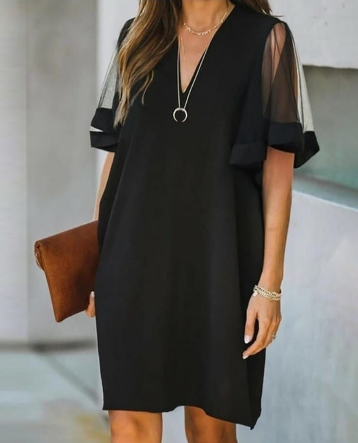 Kadın Tüllü Kısa Kollu V Yaka Krep Elbise