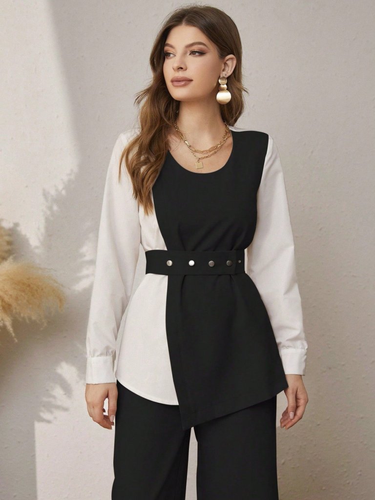 Kadın Uzun Kollu Açık Yakalı çift Renkli Kemerli Ithal Krep Ikili Takım