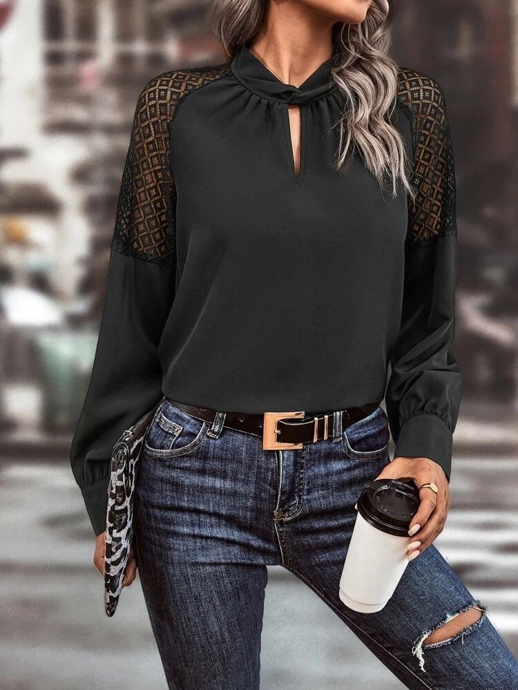 Kadın Uzun Kollu Anahtar Deliği Yaka Reglan Kol Dantel Detaylı Ithal Krep Bluz