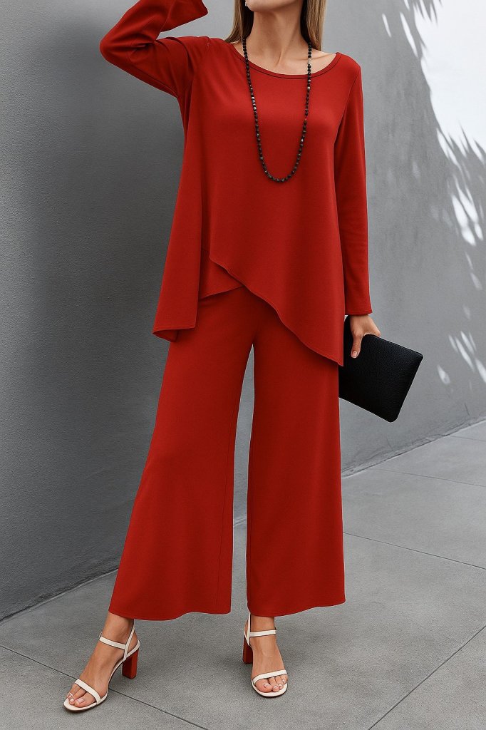 Kadın Uzun Kollu Asimetrik Detaylı Salaş Sandy Bluz Ve Pantolon Ikili Takım