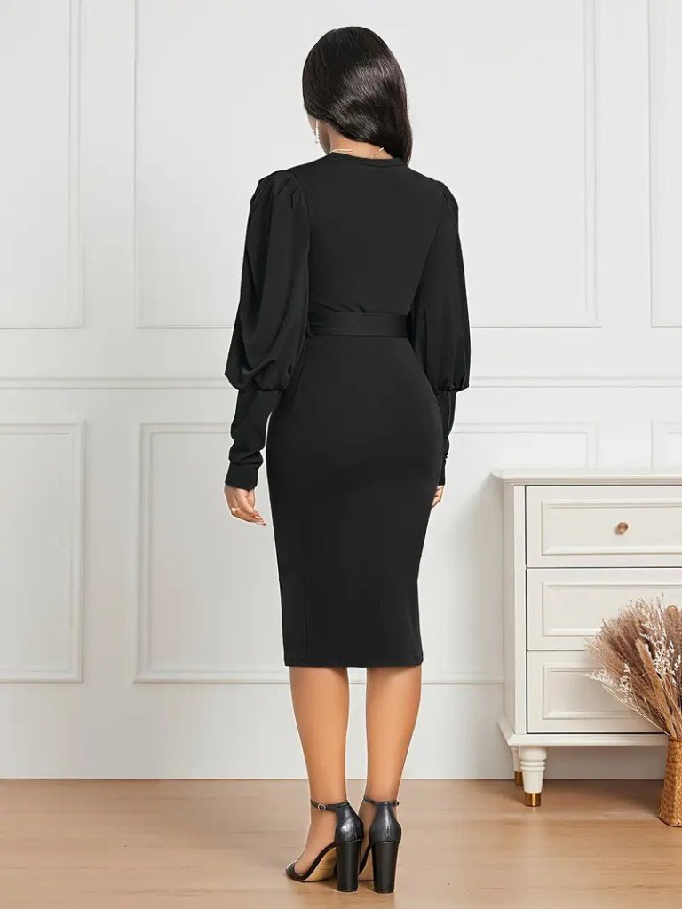Kadın Uzun Kollu Kruvaze Yaka Büzgü Ve Balon Kol Detay Krep Kumaş Maxi Boy Elbise