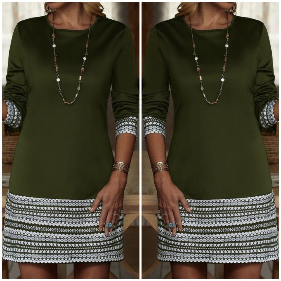 Kadın Uzun Kollu Bisiklet Yaka Kol Ağzı Ve Etek Ucu Baskılı Iki Iplik Elbise