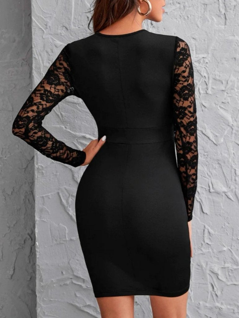 Kadın Uzun Kollu Bisiklet Yaka Kol Vegöğüs Tül Detay Krep Elbise