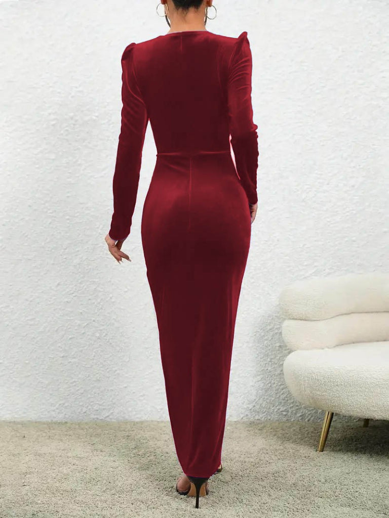 Kadın Askılı Degaje Yakalı Yırtmaçlı Kadife Midi Elbise
