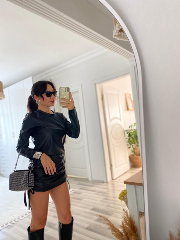 Kadın Uzun Kollu Bisiklet Yaka Yandan Büzgülü Kısa Deri Elbise