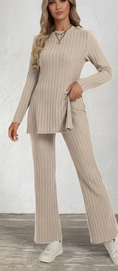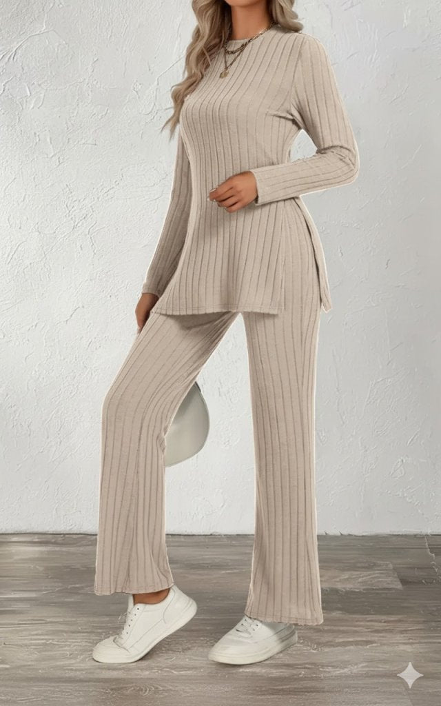 Kadın Uzun Kollu Bisiklet Yaka Yandan Yırtmaçlı şardonlu Kaşkorse Bluz Ve Pantolon Ikili Takım