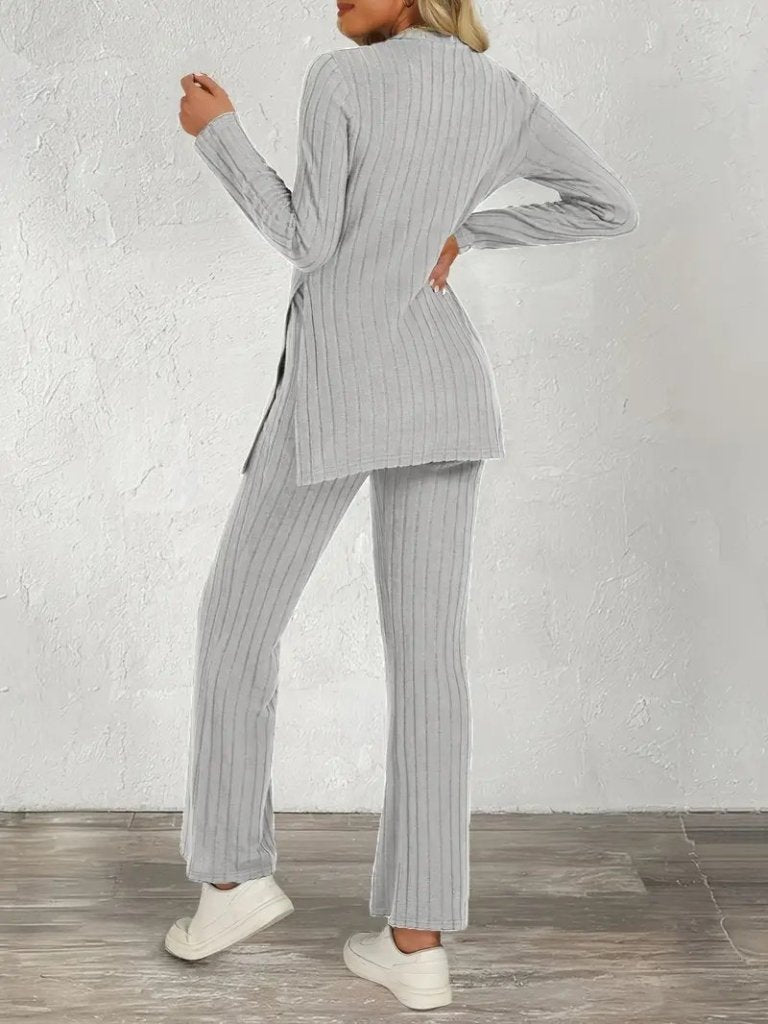 Kadın Uzun Kollu Bisiklet Yaka Yandan Yırtmaçlı şardonlu Kaşkorse Bluz Ve Pantolon Ikili Takım