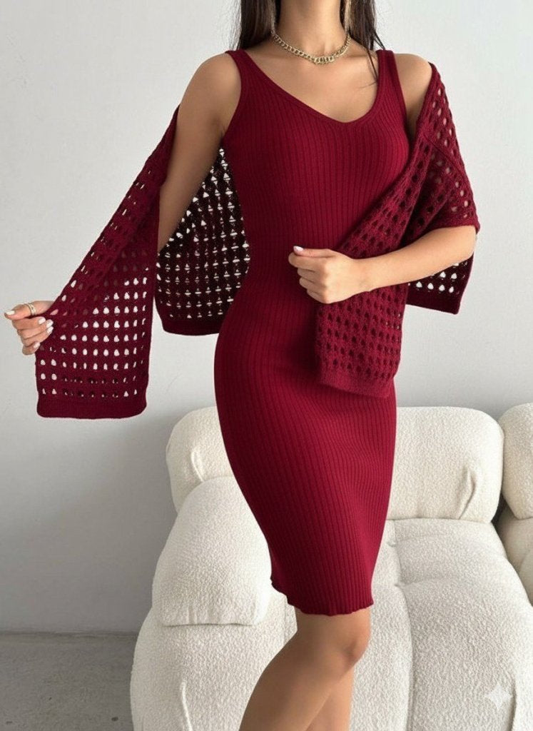 Kadın Uzun Kollu Delikli Kazak Askılı Elbise Triko Ikili Takım