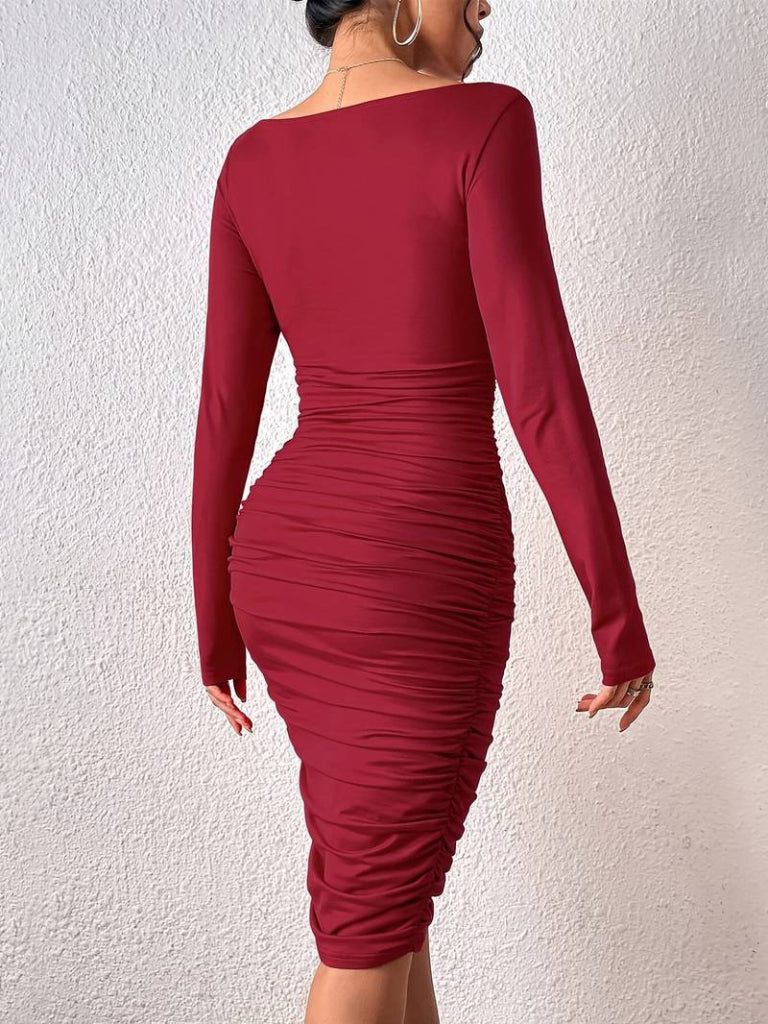 Kadın Uzun Kollu Derin Kruvaze Yakalı Büzgülü Sandy Midi Elbise