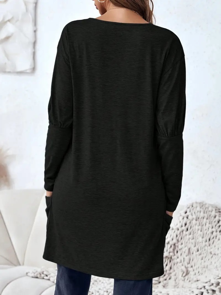 Kadın Uzun Kollu Derin V Yakalı Asimetrik Kesim Cepli Detay Yün Viskon Iki Iplik Bluz