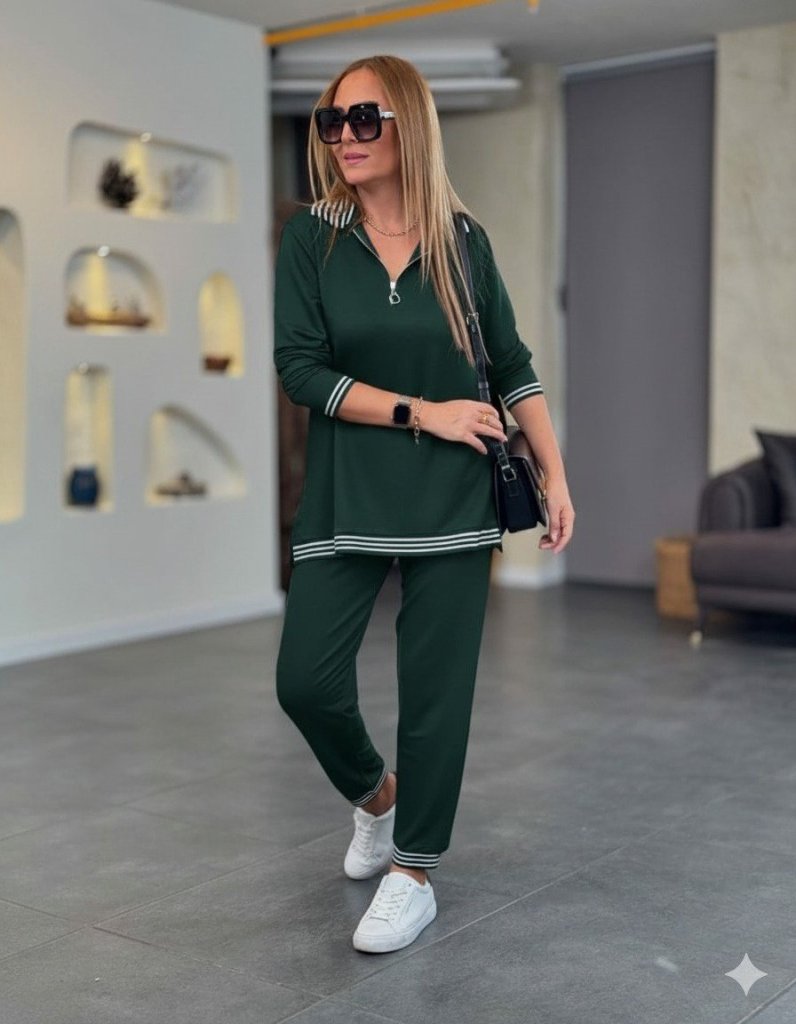 Kadın Uzun Kollu Fermuarlı şerit Detay Desenli Alt üst Ikili Viskon Iki Iplik Takım