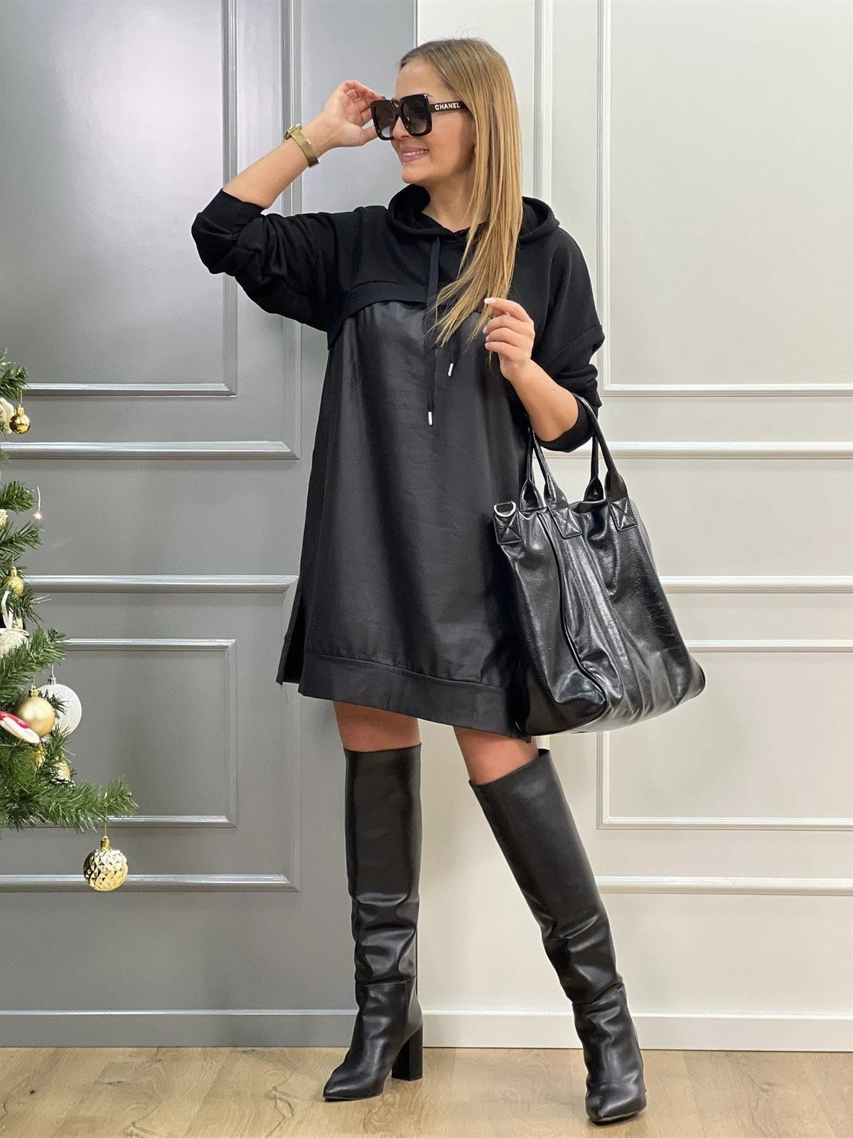 Kadın Uzun Kollu Kapüşon Ve Deri Detay Diz üstü Elbise