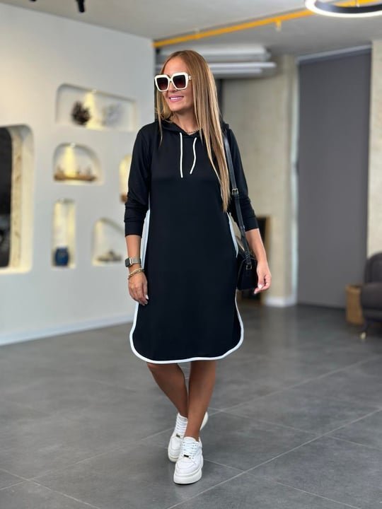 Kadın Uzun Kollu Kapüşon Ve Ribana Detay Diz üstü Elbise