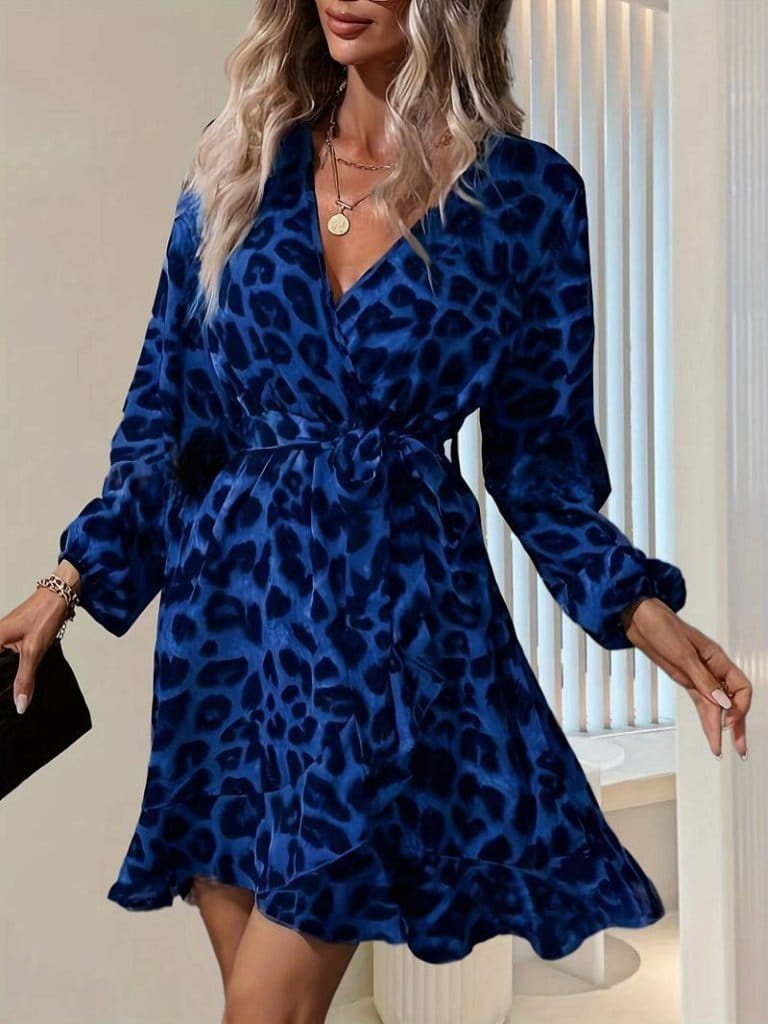 Kadın Uzun Kollu Kruvaze Yaka Belden Kuşaklı çapraz Kesim Detaylı Leopar Modal Mini Elbise