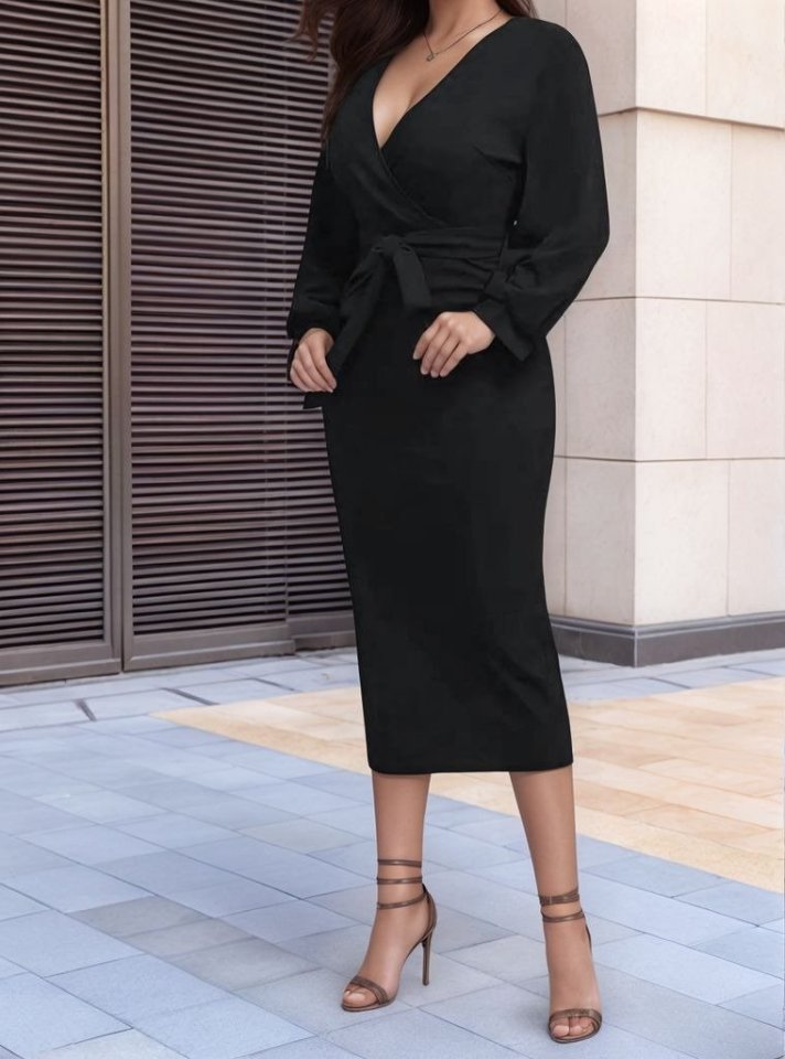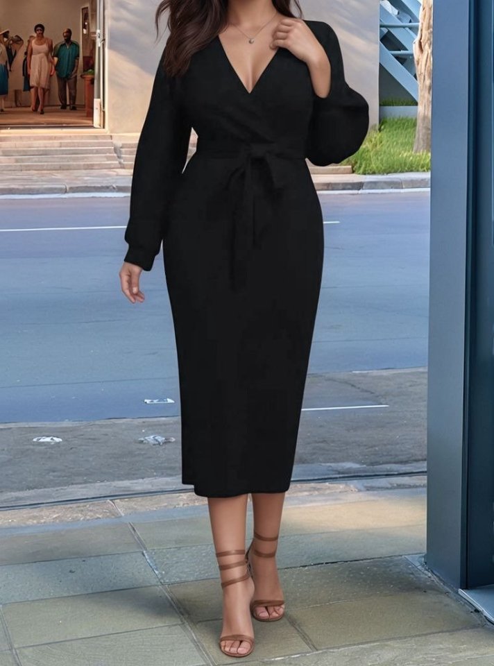 Kadın Uzun Kollu Kruvaze Yaka Belden Kuşaklı Midi Ithal Krep Elbise