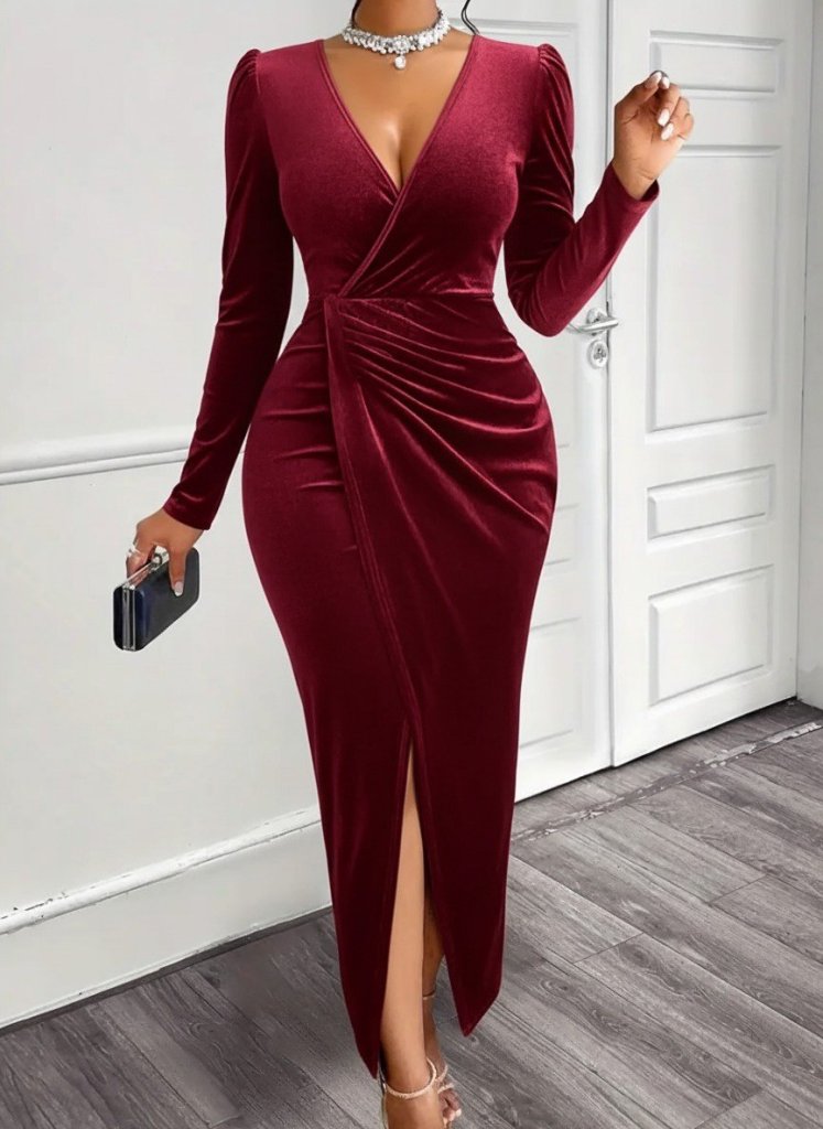 Kadın Uzun Kollu Kruvaze Yaka önünden çapraz Detaylı Uzun Kadife Elbise