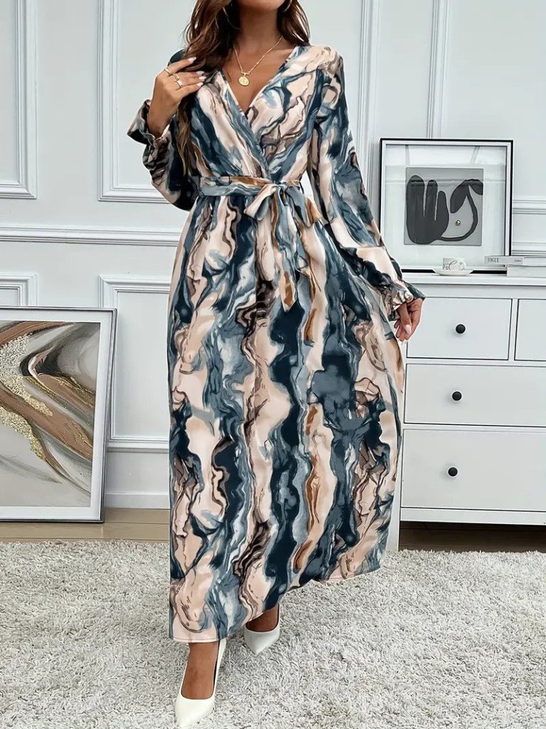 Kadın Uzun Kollu Kruvaze Yakalı Beli Kuşaklı Desenli Süprem Maxi Elbise