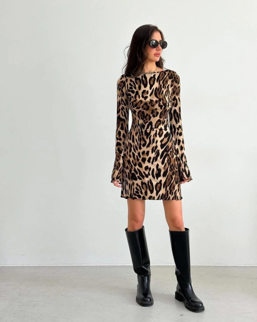 Kadın Uzun Kollu Sırtı Açık Bağlamalı Leopar Desenli Kısa Dalgıç Elbise