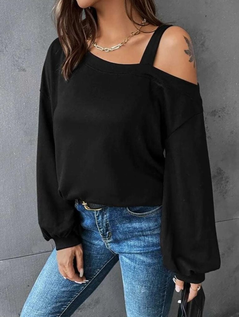 Kadın Uzun Kollu Tek Omuz Askı Detay Salaş Viskon Iki Iplik Bluz