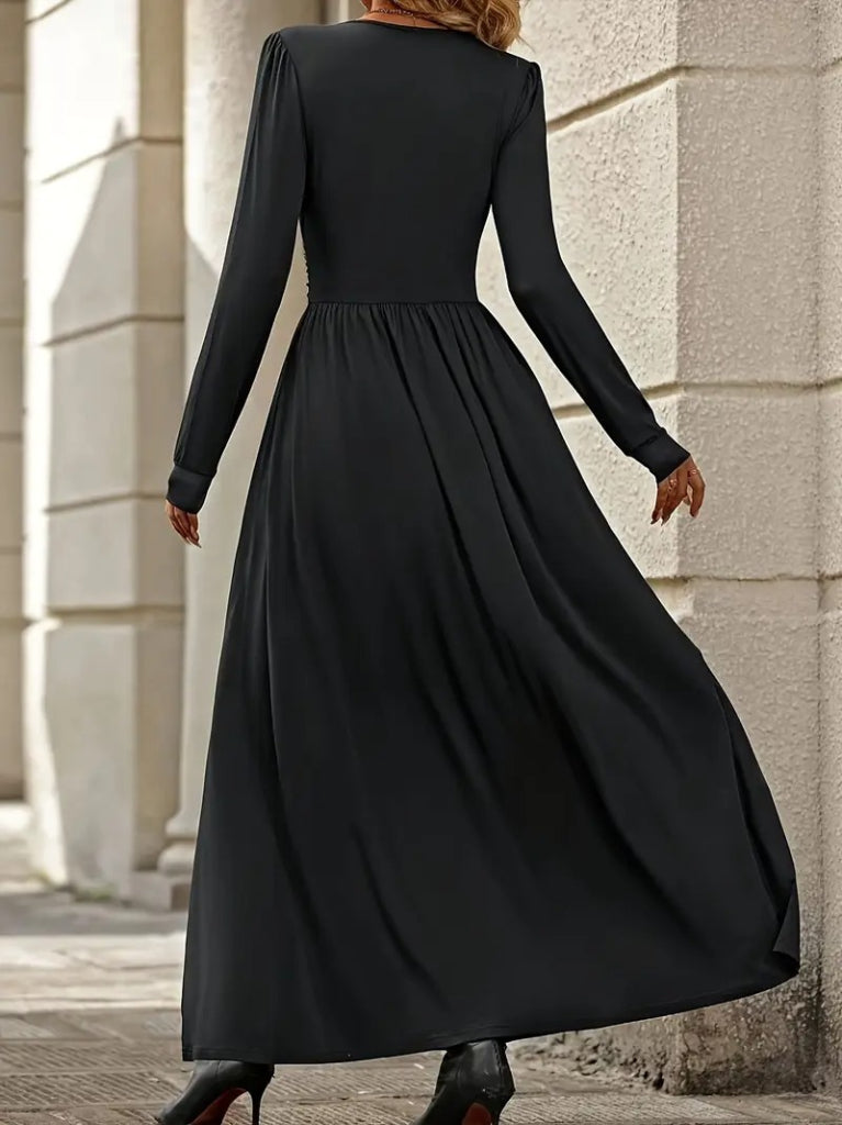 Kadın Uzun Kollu Kruvaze Yaka Büzgü Ve Balon Kol Detay Krep Kumaş Maxi Boy Elbise