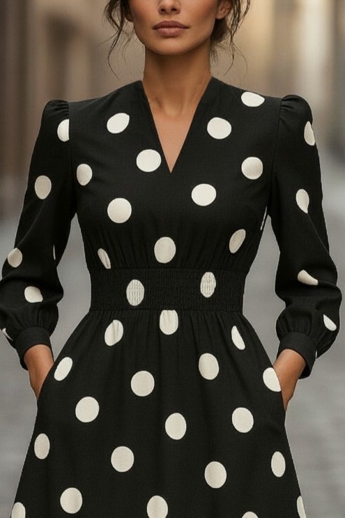 Kadın Uzun Kollu V Yakalı Beli Lastikli Puantiyeli Uzun Krep Elbise
