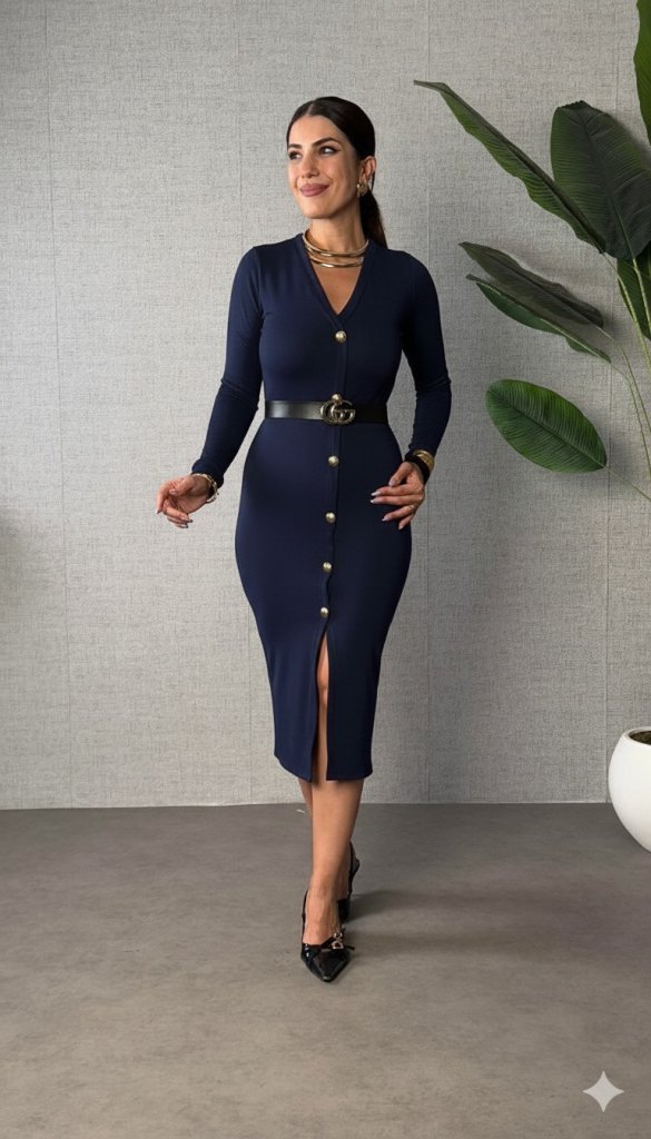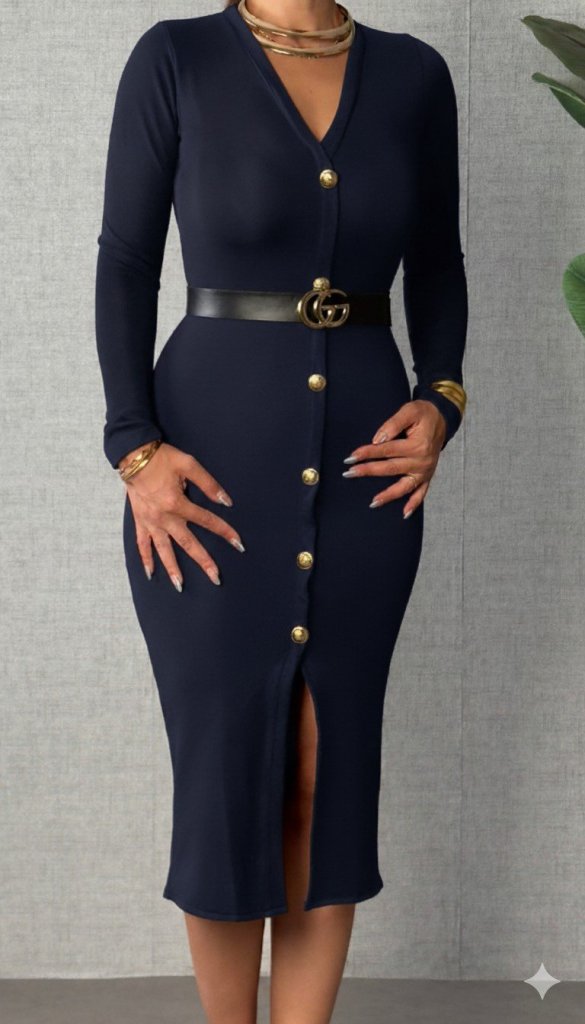Kadın Uzun Kollu V Yakalı önden Düğmeli Yırtmaçlı Modal Midi Kemersiz Elbise