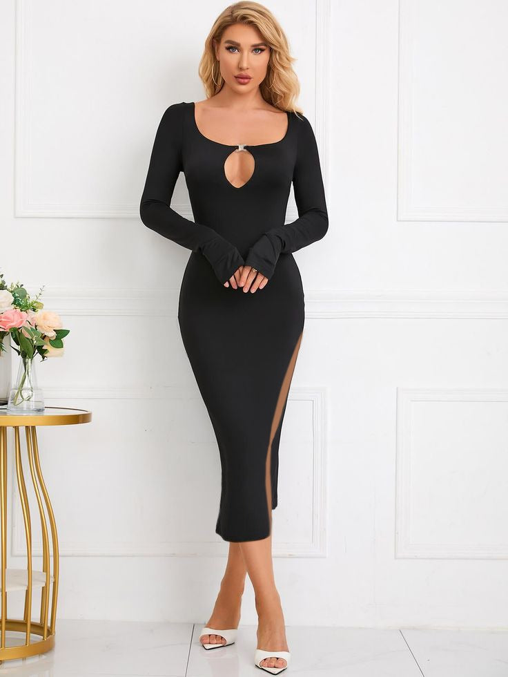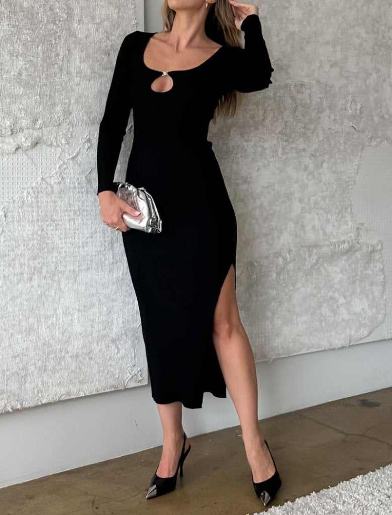Kadın Uzun Kollu Yaka Damla Detay Mini Aksesuarlı Yırtmaç Detay Krep Elbise