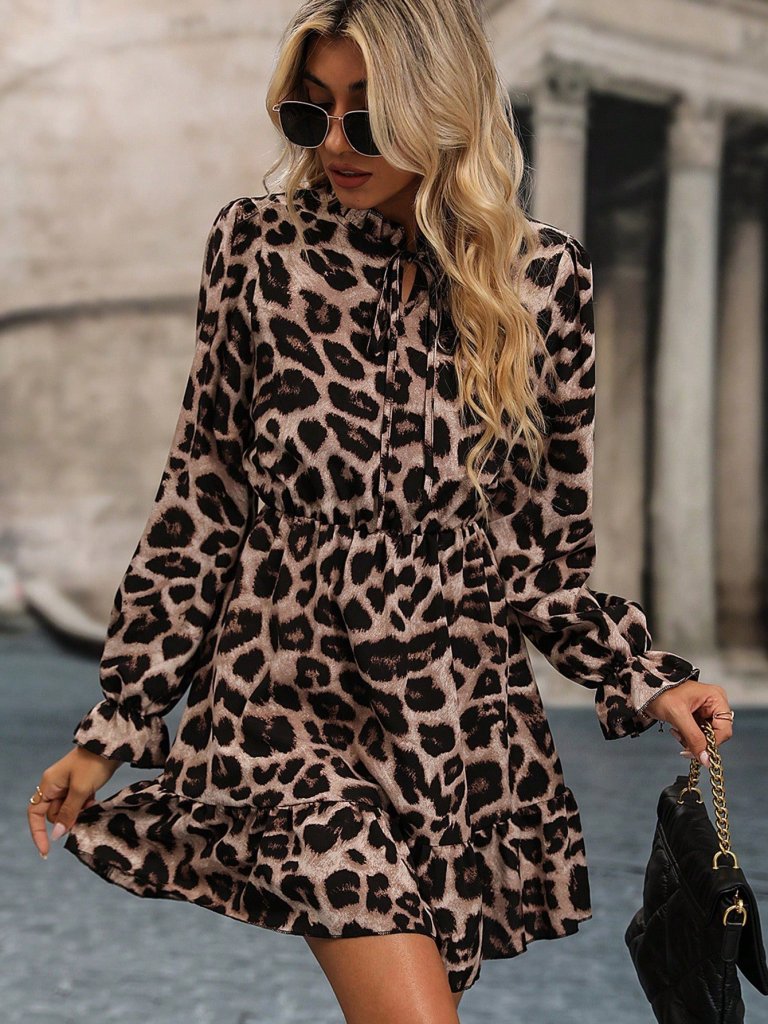 Kadın Uzun Kollu Yakadan Bağcıklı Modal Leopar Desenli Mini Elbise