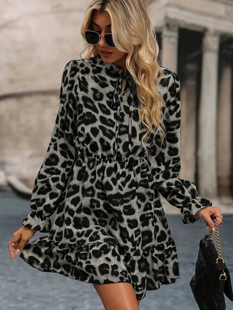 Leopar Sırt Detaylı Leopar Desenli Saten Elbise