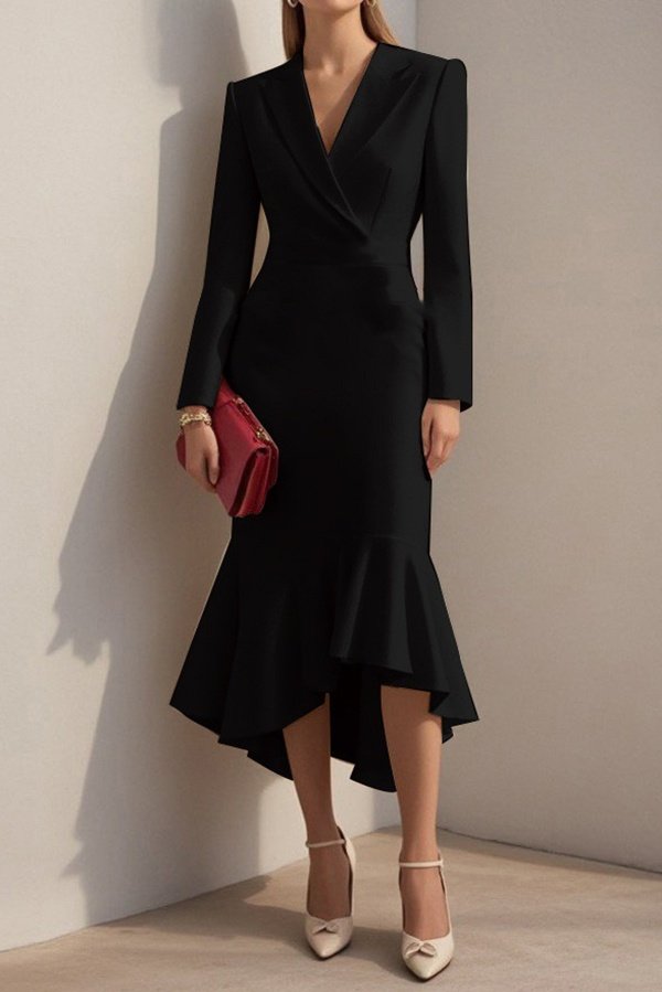 Kadın Uzun Kollu Kruvaze Yaka Büzgü Ve Balon Kol Detay Krep Kumaş Maxi Boy Elbise